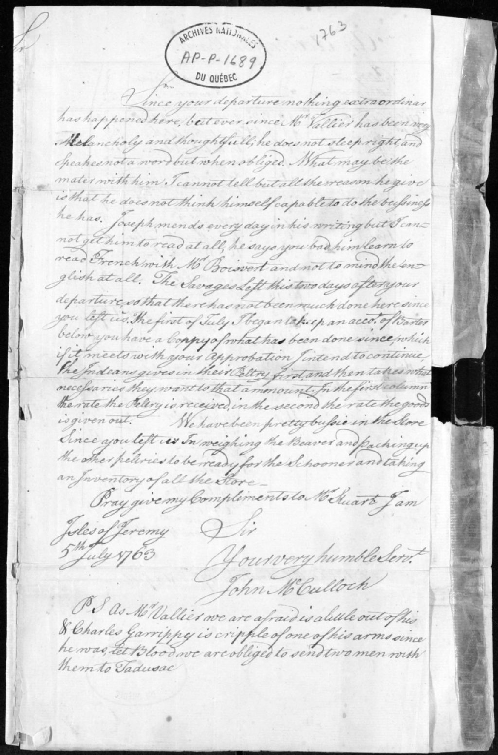 - Ce dossier contient l'état des crédits faits aux Sauvages tant dans les terres que dans la mer. Lettre de John McCulloch à John Gray concernant le commerce des îlets de Jérémie. Contrat de location des Postes du Roi par James Murray en faveur de Thomas Dunn et John Gray. Deux mémoires présentés aux commissaires pour le commerce et les plantations par John Gray. Brouillon d'un mémoire sur les Postes du Roi. Etat des Postes du Roi