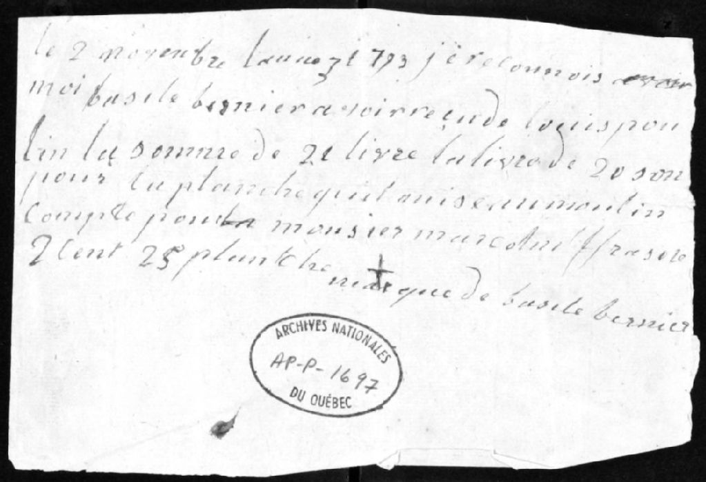 - Ce dossier est constitué d'un compte de Louis Poulin pour des planches et des madriers vendus par Basile Bernier, s.d. Reçu signé par Basile Bernier, 2 nov. 1793