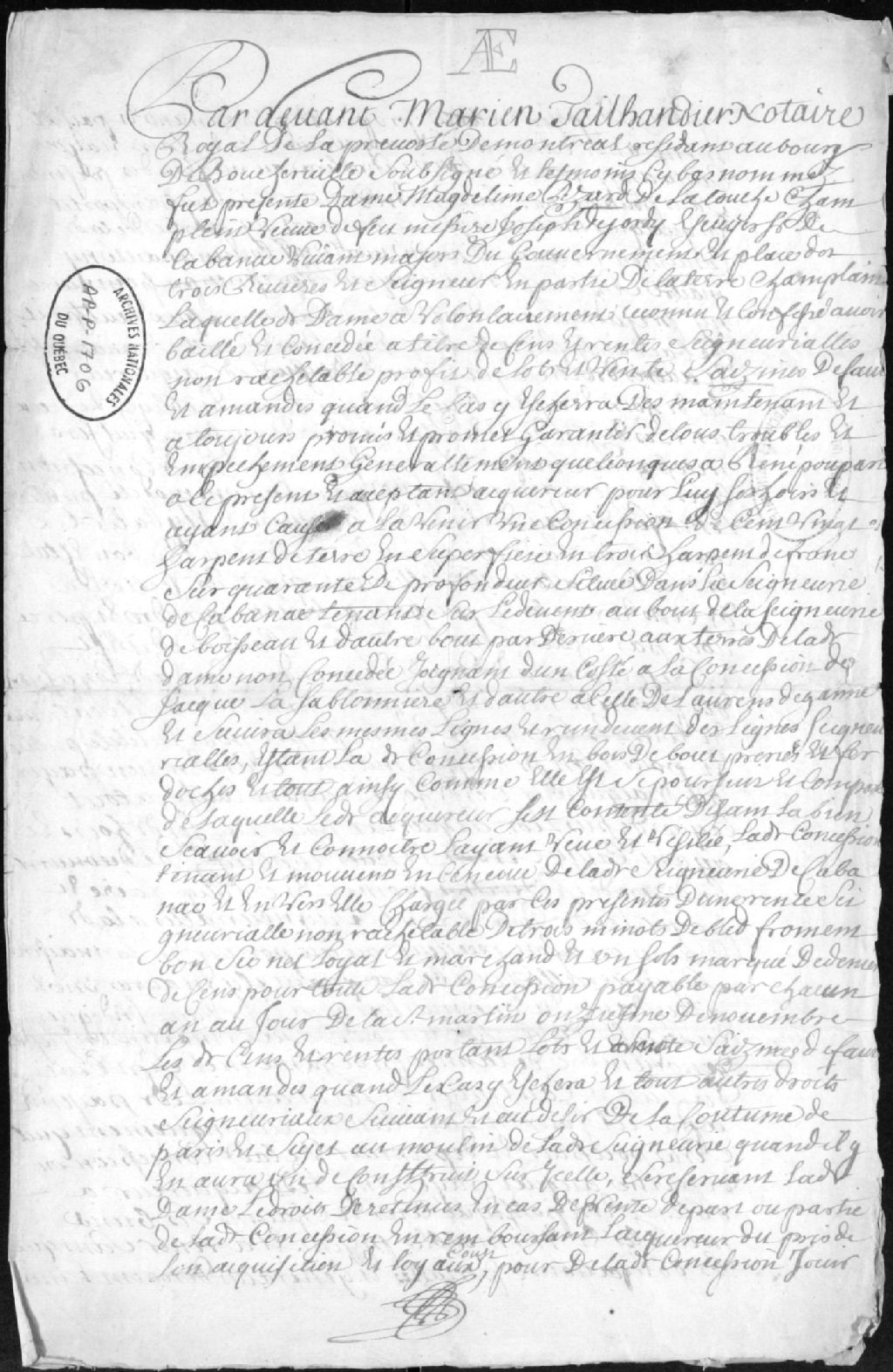 - Ce dossier est constitué d'une concession par dame Madeleine Pézard de la Touche Champlain, veuve de Joseph Desjordy de Cabanac d'une terre dans la seigneurie de Cabanac; au bas: transport de la concession ci-dessus par René Poupart à Charles Charon, habitant de Verchères