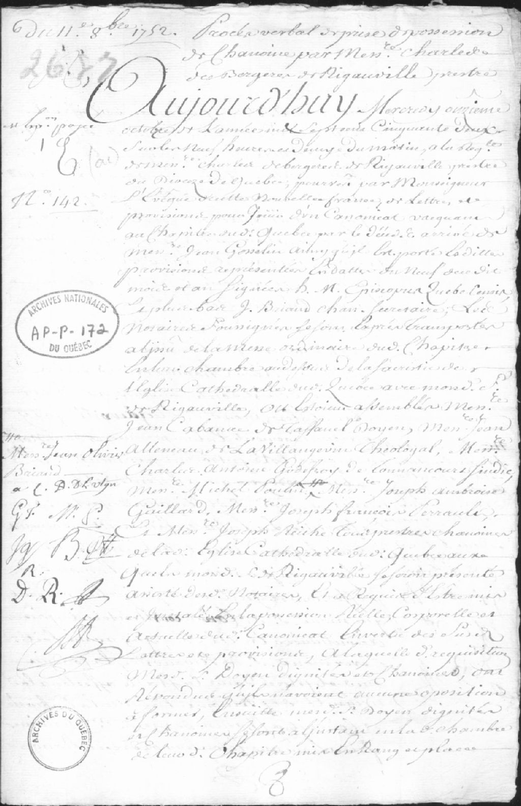 Prise de possession d'un canonicat vacant par Charles des Bergères de Rigauville, 11 octobre 1752, Archives nationales à Québec, Collection Centre d'archives de Québec, (03Q,P1000,S3,D172).