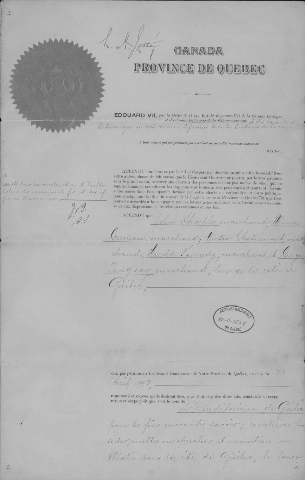 Lettres patentes incorporant l'Auditorium de Québec, Avril 1902, Archives nationales à Québec, Collection Centre d'archives de Québec, (03Q,P1000,S3,D1729).