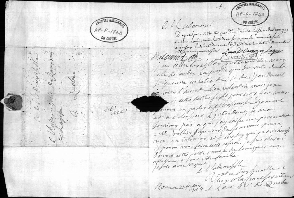 Lettre de Mgr P.-H. Dosquet à Louise de Ramezay Lagesse, 21 février 1745, Archives nationales à Québec, Collection Centre d'archives de Québec, (03Q,P1000,S3,D1760).