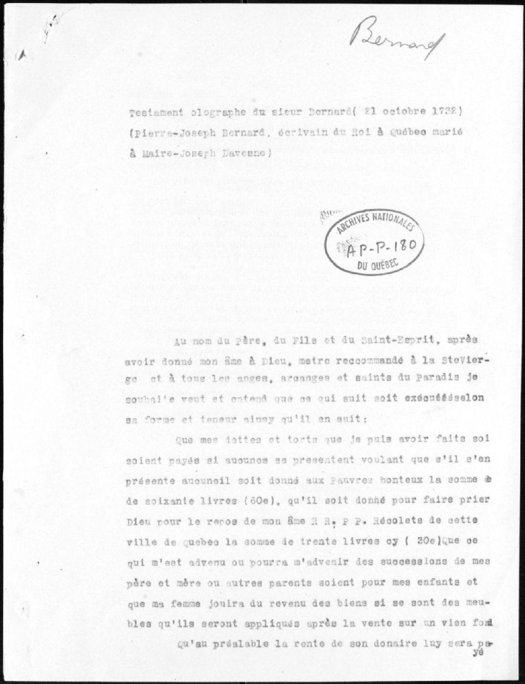 - Testament olographe de Pierre-Joseph Bernard