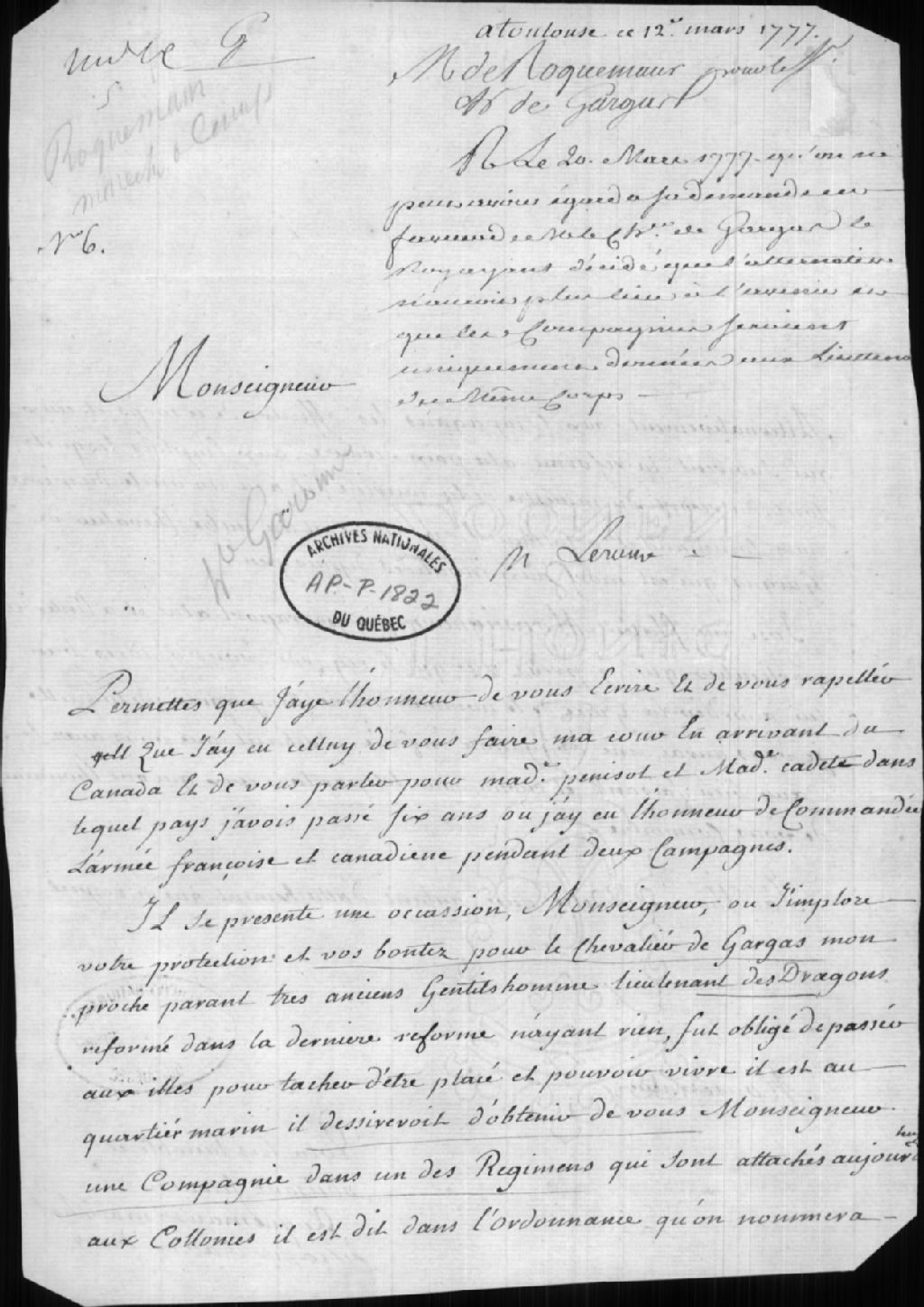 - Ce dossier est constitué des copies manuscrite et dactylographiée d'une lettre du maréchal de camp Roquemaur à Monseigneur demandant une compagnie dans un des régiments attachés aux Colonies pour le chevalier de Gargas
