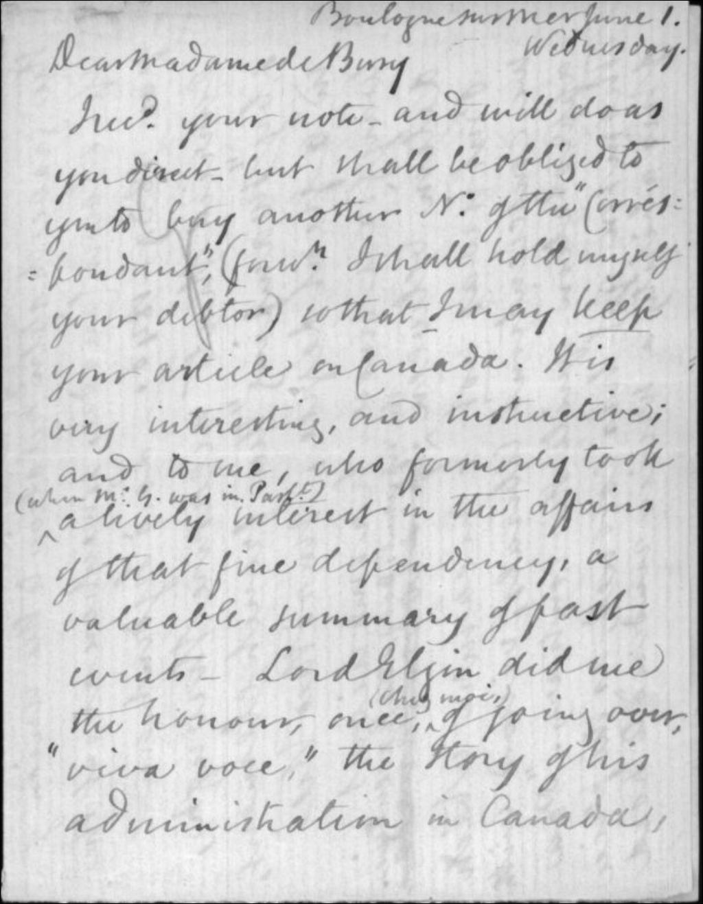 - Ce dossier est composé d'une lettre de M. Groté à Mme de Berrey (Bury) dans laquelle il commente les décisions de Lord Sydenham et mentionne Lord Elgin. On retrouve également une copie manuscrite de cette lettre