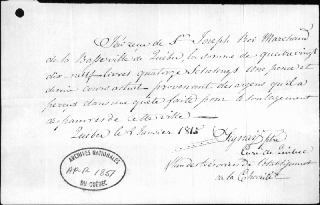 - Ce dossier est constitué des documents suivants: une conventions de mariage entre Joseph Roy et Louise Dupuy, 1766; un reçu accordé à Roy par J. Signay, ptre, pour une somme d'argent recueillie dans le but de soulager les pauvres de Québec, 1815; un brouillon d'un mémoire concernant les mandats d'arrestation émis contre le lieutenant-colonel Mackintosh et le capitaine Temple; un extrait d'une lettre du lieutenant-colonel Mackintosh au secrétaire militaire, sur le même sujet; un projet de lettre de Roy à Henry Craig, expliquant son point de vue dans l'accusation de meurtre émise contre les deux officiers; une lettre de H. Craig à Roy au sujet de la destitution de Roy; une lettre de Roy à H. Craig, sur le même sujet; trois affidavits (Antoine Royer, Michel Legros dit Lecomte et Paul Durocher) concernant la conduite de Louis-Hippolyte Lafontaine lors de l'élection de 1832 dans le quartier ouest de Montréal; une lettre de H. Craig à Roy concernant l'affaire Mackintosh et Temple