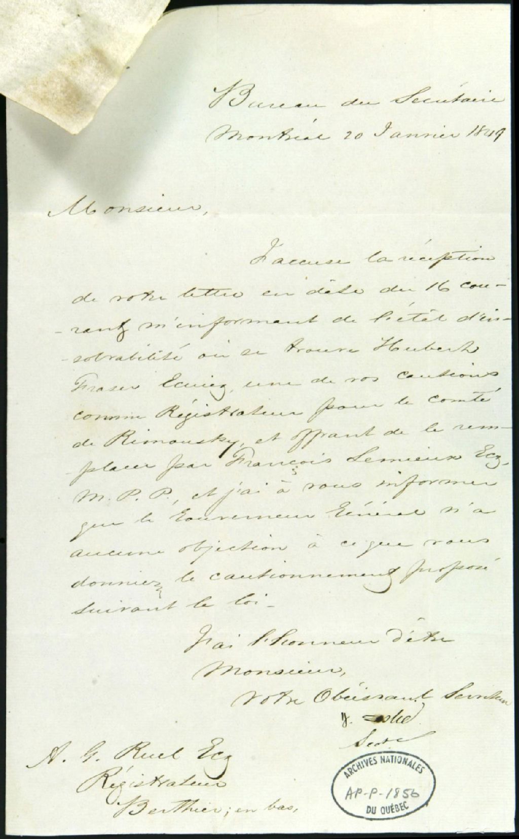 Cautions pour Auguste-Guillaume Ruel, 1842-1849, Archives nationales à Québec, Collection Centre d'archives de Québec, (03Q,P1000,S3,D1856).