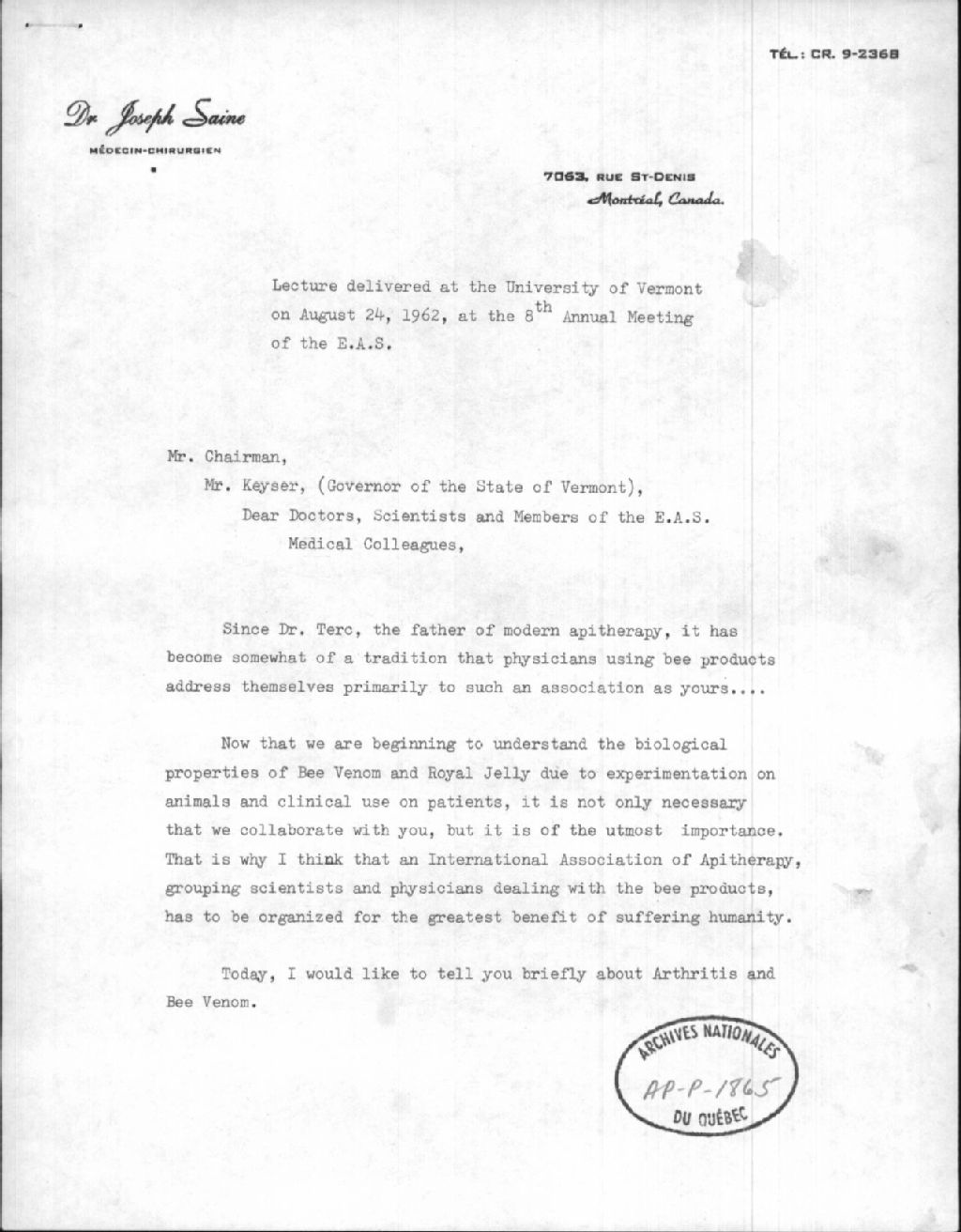 Ce dossier est constitué d'une photocopie sur papier à en-tête de son cabinet de médecin d'une causerie donnée par le docteur Saine, à l'université du Vermont, sur l'arthrite et l'apithérapie et d'une copie dactylographiée d'un extraits de la revue "Annals of Internal Medecine"