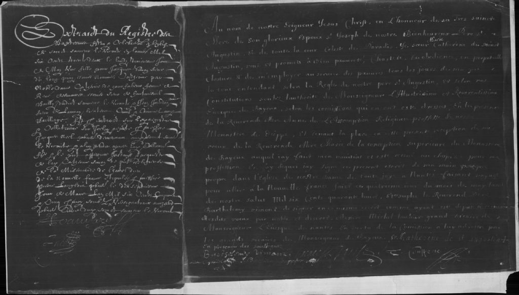 Extraits de naissance et profession de voeux de mère Catherine De Saint-Augustin, 1632-1655, Archives nationales à Québec, Collection Centre d'archives de Québec, (03Q,P1000,S3,D1878).