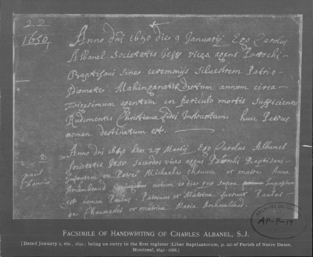 - Ce dossier est constitué d'un photostat concernant deux entrées (en latin) pour baptême à Notre-Dame de Montréal en 1650 et d'une copie manuscrite d'une lettre de Talon concernant le voyage du Père Albanel (1616-1696) dans la région de Mistassini en 1671. On retrouve également une copie dactylographiée de cette lettre. Le premier baptême est celui de Diomate Mahinganatik fait le 9 janvier 1650. L'autre baptême est celui de Paul, fils de Michele Chauvin (père) et Anna Archambeaud fait le 27 mars 1650