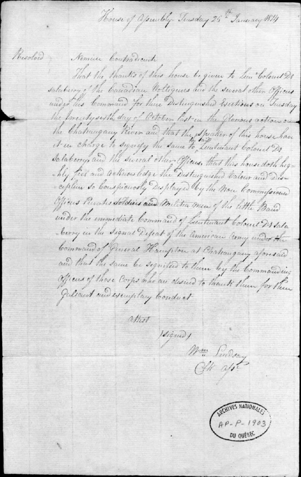 - Ce dossier est constitué des originaux et de copies dactylographiées d'une lettre de James Willoughby Gordon, secrétaire du duc de Kent, au Colonel Charles-Michel de Salaberry (1778-1829) au sujet de la position de Salaberry dans l'armée, ce dernier est bien vu du duc d'York, etc., 23 juin 1800 et remerciements de l'Assemblée législative au héros de la bataille de Châteauguay, signé William Lindsay, assistant greffier