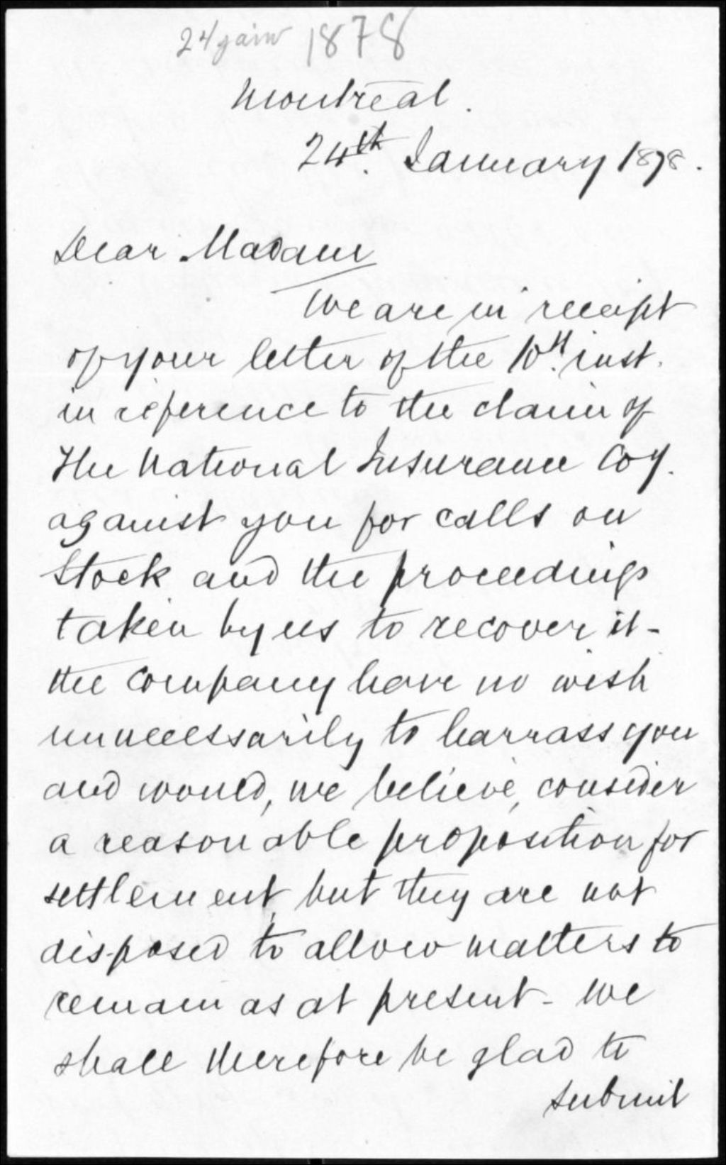 - Ce dossier est composé de deux polices d'assurance contre le feu émises par l'Ottawa Agricultural Insurance Co. et Canada Agricultural Insurance Co., 1878. 6 pages, et une lettre de Robert Gee à la veuve Bezeau concernant une réclamation de la National Insurance Co., 24 janv. 1878. 2 pages