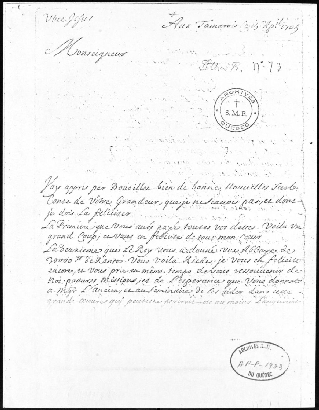 - Ce dossier est constitué des documents suivants: le photostat du mandement pour l'érection de la cure de Québec et union au séminaire, signé par Mgr de Laval, 1664; la photocopie de la lettres de curé de Québec pour Henri de Bernières installé par monsieur de Lauzon; la photocopie de la lettre par l'abbé Bergier à Mgr de St-Vallier sur la mission des Tamarois au Mississipi, 16 avril 1705; la photocopie de la liste des prêtres du séminaire avec dates de naissance, d'arrivée au Canada, d'ordination, genre de travail, retour en France, décès; le fac-similé de signatures avec index, par G.-A. Desjardins; le photostat de la liste de dons, 1647-1693 (Grand format)