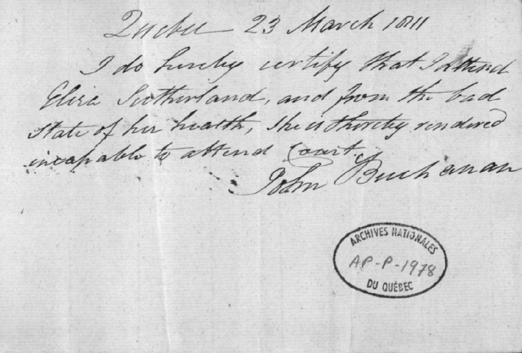 Certificat médical Elisa Sutherland, 23 mars 1811, Archives nationales à Québec, Collection Centre d'archives de Québec, (03Q,P1000,S3,D1978).