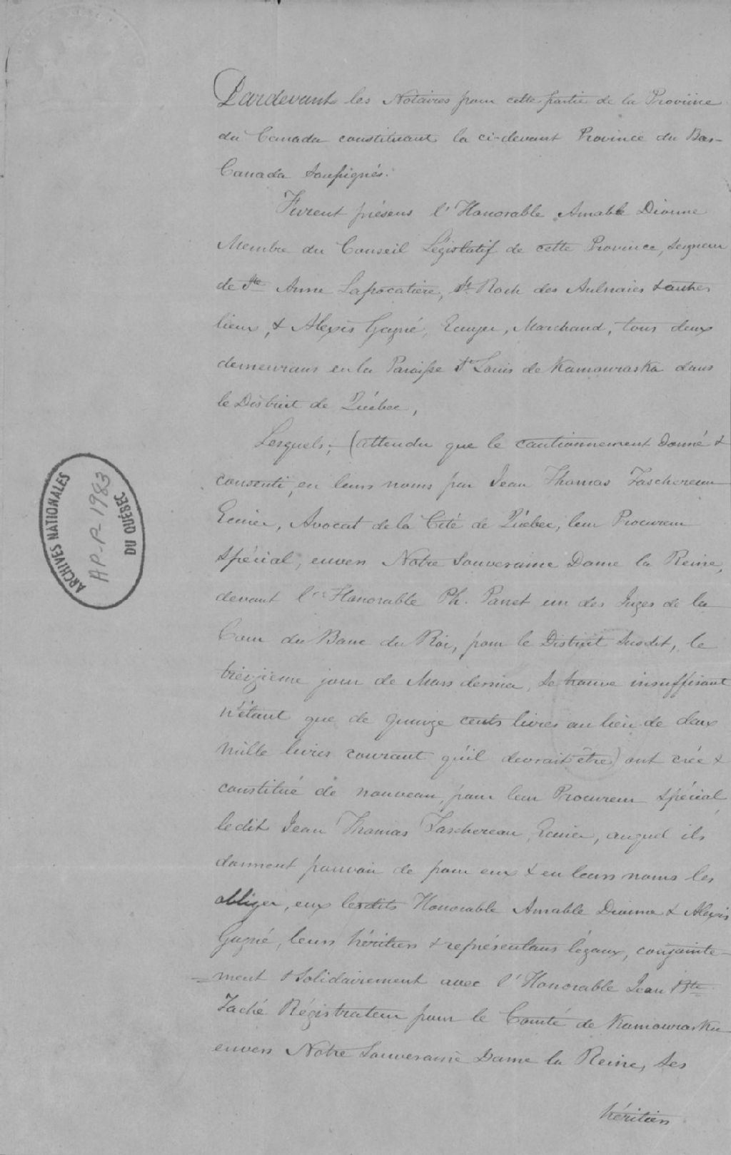 - Ce dossier est composé de trois procurations accompagnées des trois documents concernant le cautionnement d'Amable Dionne et Alexis Gagné à Jean-Thomas Taschereau pour la nomination de Jean-Baptiste Taché comme registraire du comté de Kamouraska, signée Ph. Panet (Grand format)