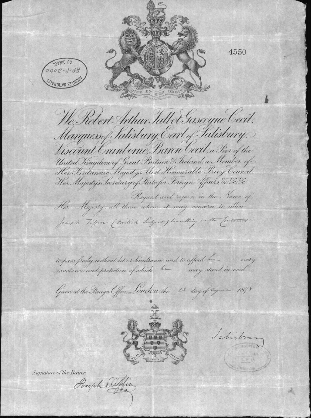 Passeport de Joseph Tiffin, 23 août 1878, Archives nationales à Québec, Collection Centre d'archives de Québec, (03Q,P1000,S3,D2000).