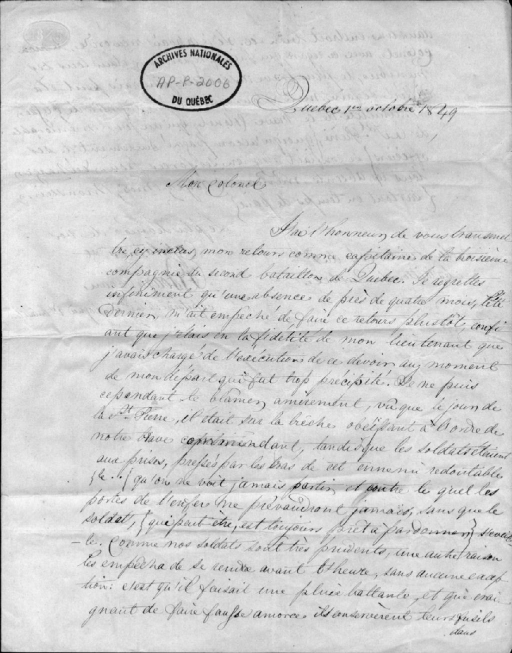 Ce dossier contient une lettre au lieutenant-colonel du second bataillon de Québec qui concerne le retour de Tourangeau comme capitaine de la 3e Compagnie du second Bataillon de Québec