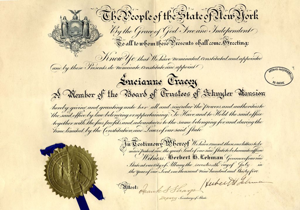 Ce dossier contient des lettres patentes signées Hebert-H. Lehman, gouverneur de l'État de New York, nommant Madame Tracey comme membre du conseil d'administration de la maison Schuyler (Board of trustees of Shuyler Mansion). Grand format