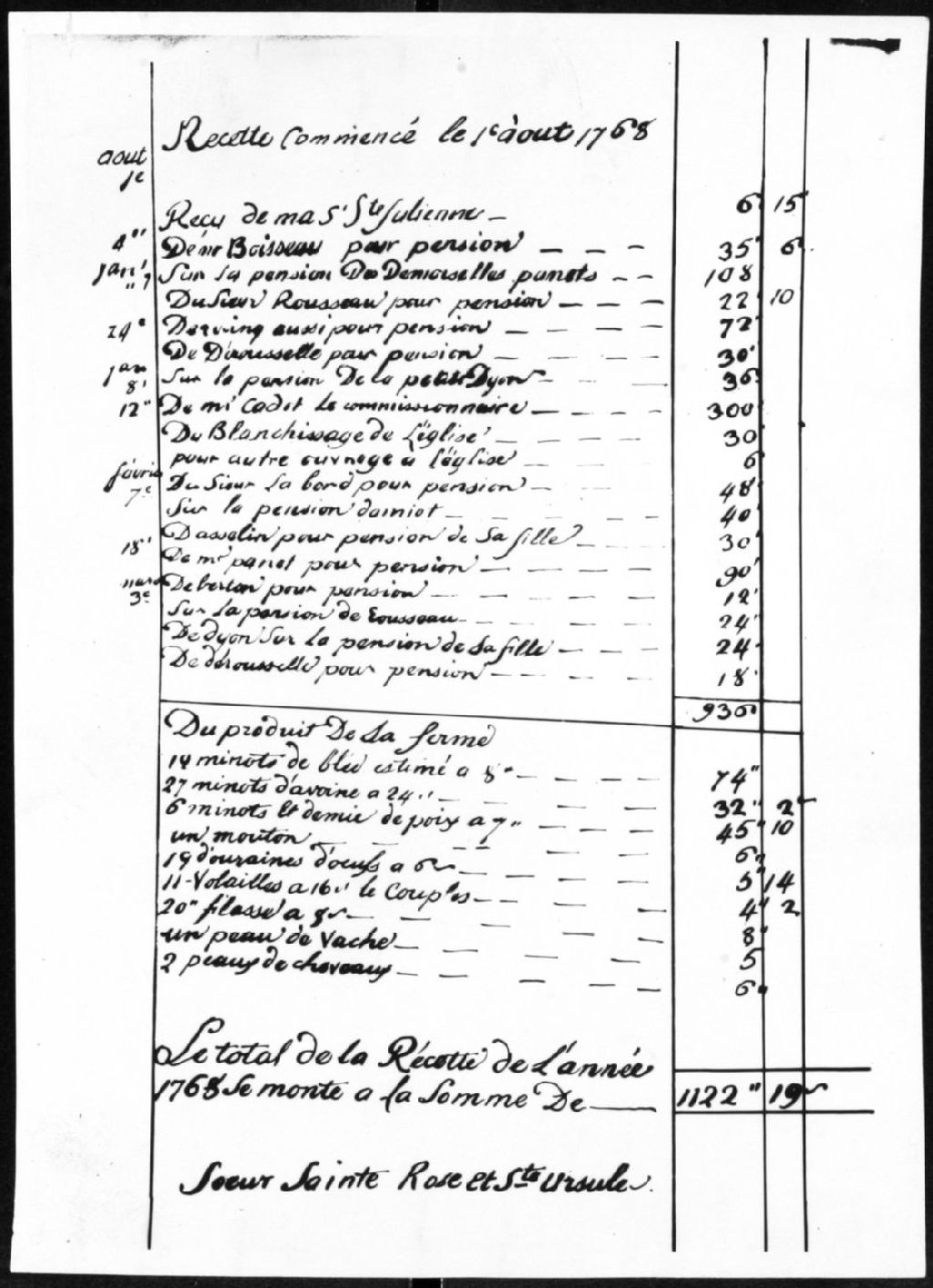 - Ce dossier contient la copie dactylographiée d'une concession par les Ursulines à Joseph Grenier, habitant de la paroisse de Sainte-Croix; le photostat d'un tableau des recettes d'un couvent, 1768; un titre à bail du passage de la rivière du Loup à Ambroise Lavergne; une concession par les Ursulines à Joseph et Louis Paillé; une concession par les Ursulines à Joseph et François Paillé; une concession par les Ursulines à Amadore Jarlais; une concession par les Ursulines à Charles Jarlais et une concession par les Ursulines à Joseph Jarlais