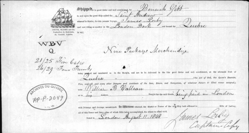 Ce dossier est un connaissement pour marchandises expédiées sur le navire Saint Andrew à William B. Valleau par B. Gibb, du port de Londres au port de Québec
