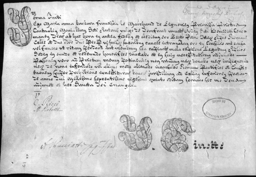 - Ce dossier contient une copie manuscrite écrite en latin d'une bulle de la cour de Rome signée C. Ricci et A. Roberti