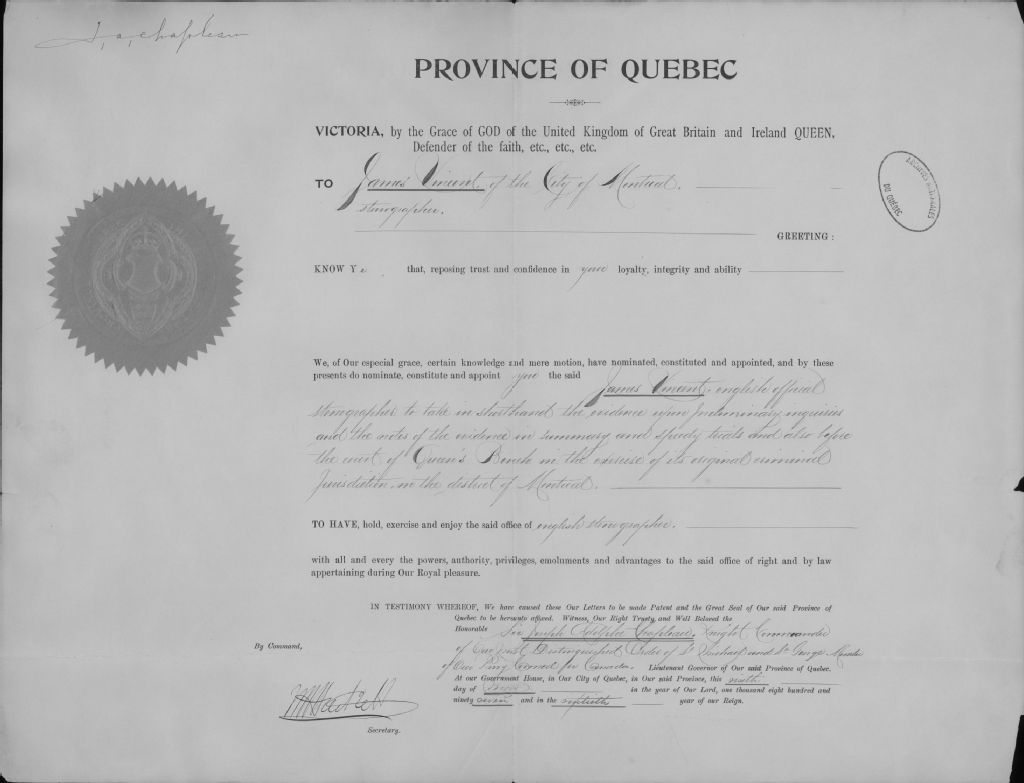 - Ce dossier contient une commission de sténographe anglais officiel pour le district judiciaire de Montréal (grand format)
