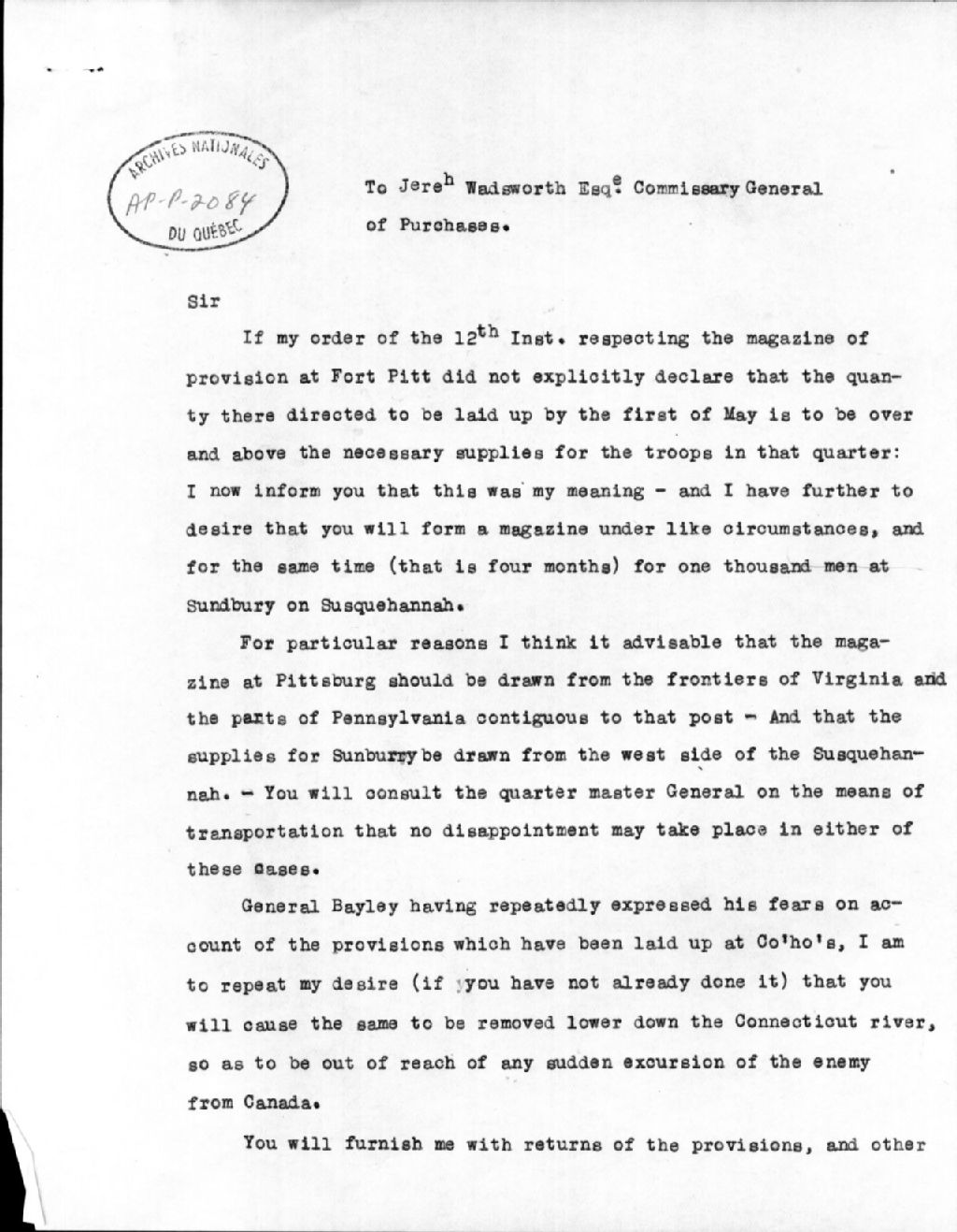 Lettre de George Washington à Jeremiah Wadsworth, 14 février 1779, Archives nationales à Québec, Collection Centre d'archives de Québec, (03Q,P1000,S3,D2084).