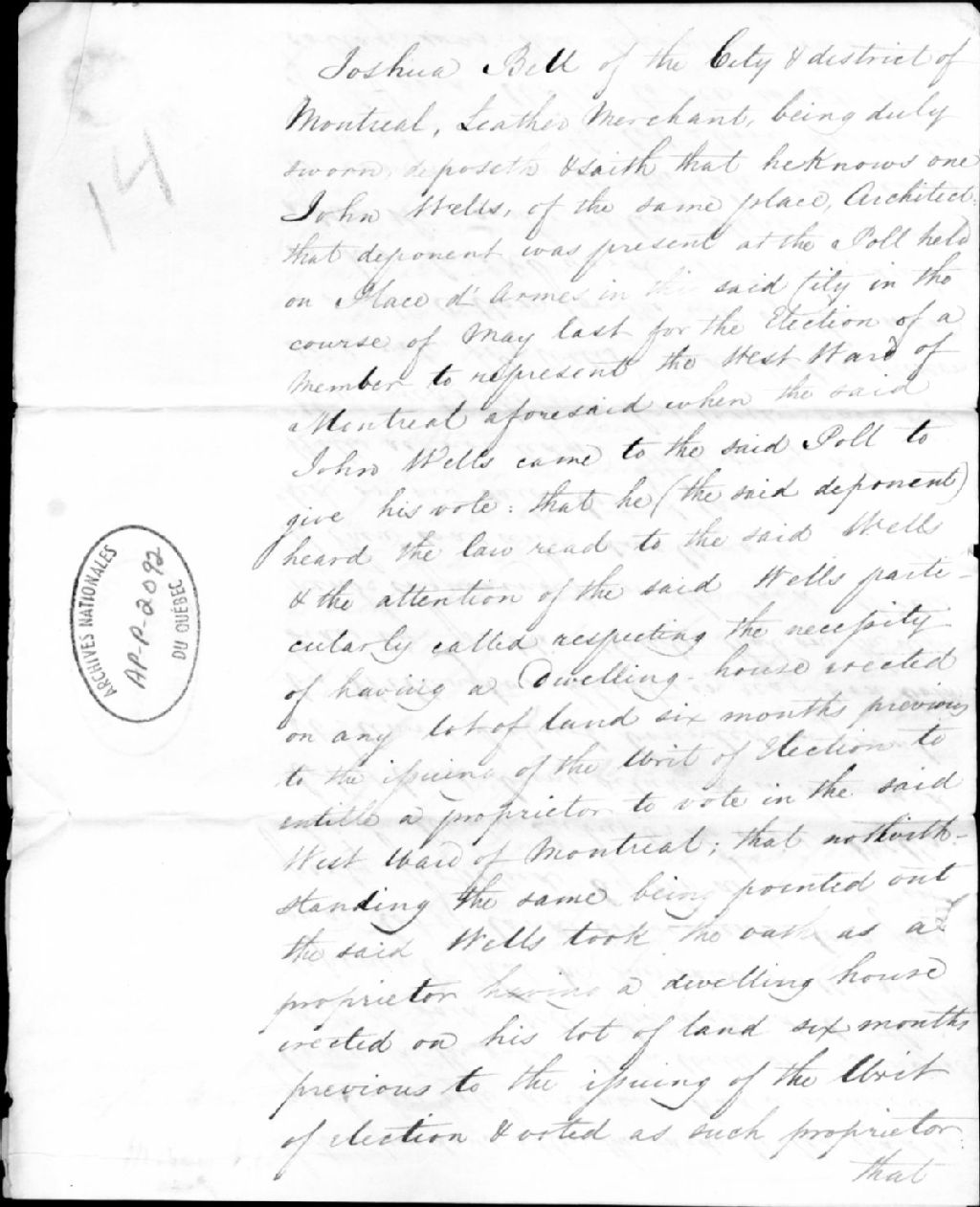 - Ce dossier contient des dépositions de William Galt, tanneur, et de Joshua Bell, marchand de cuir, contre John Wells qui a voté à une élection sans être qualifié