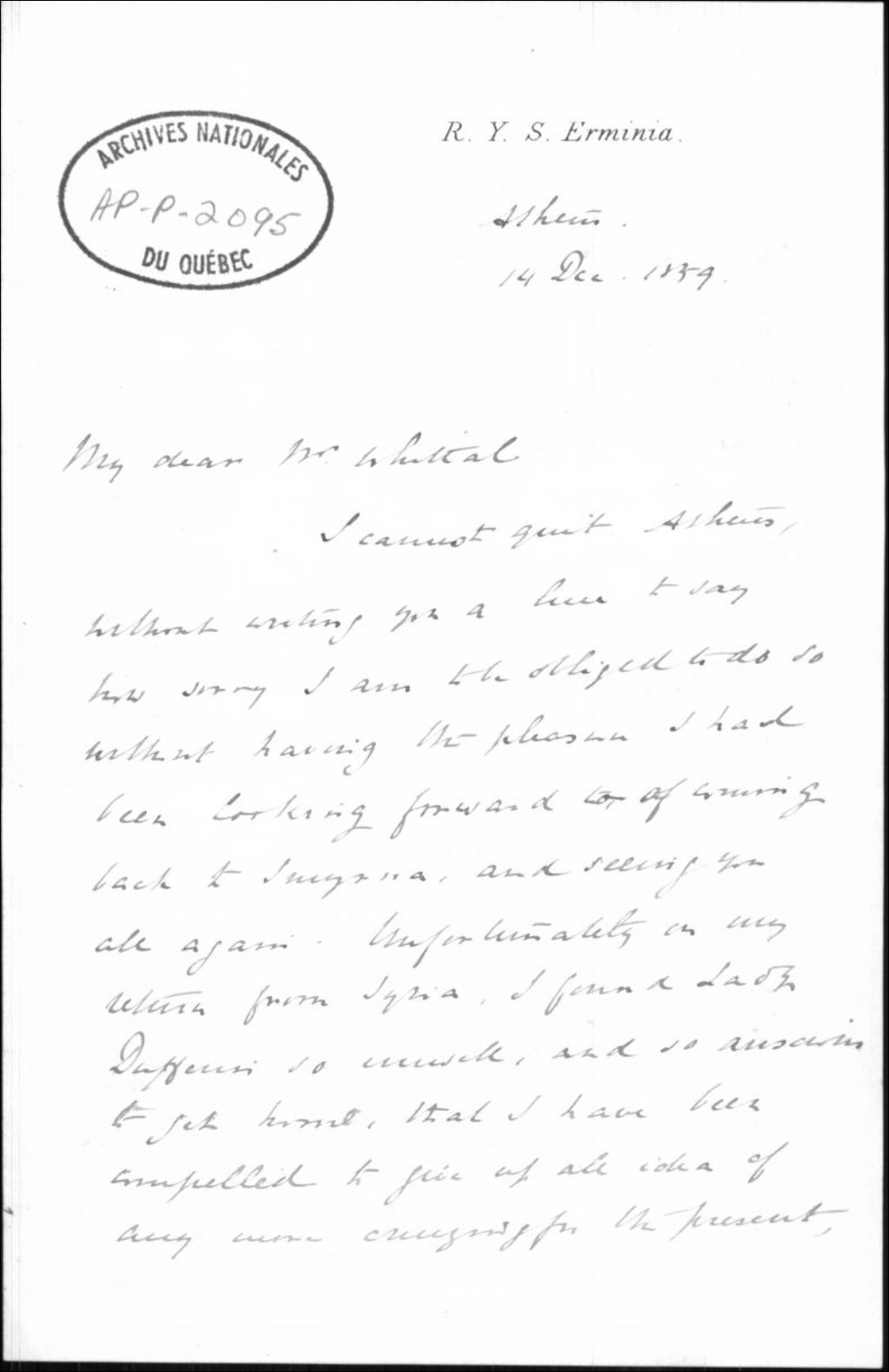 - Ce dossier contient une lettre de Lord Dufferin à Whiltal (Whittal): il est question de la santé de Lady Dufferin, de la gentillesse de la famille Whiltal, etc