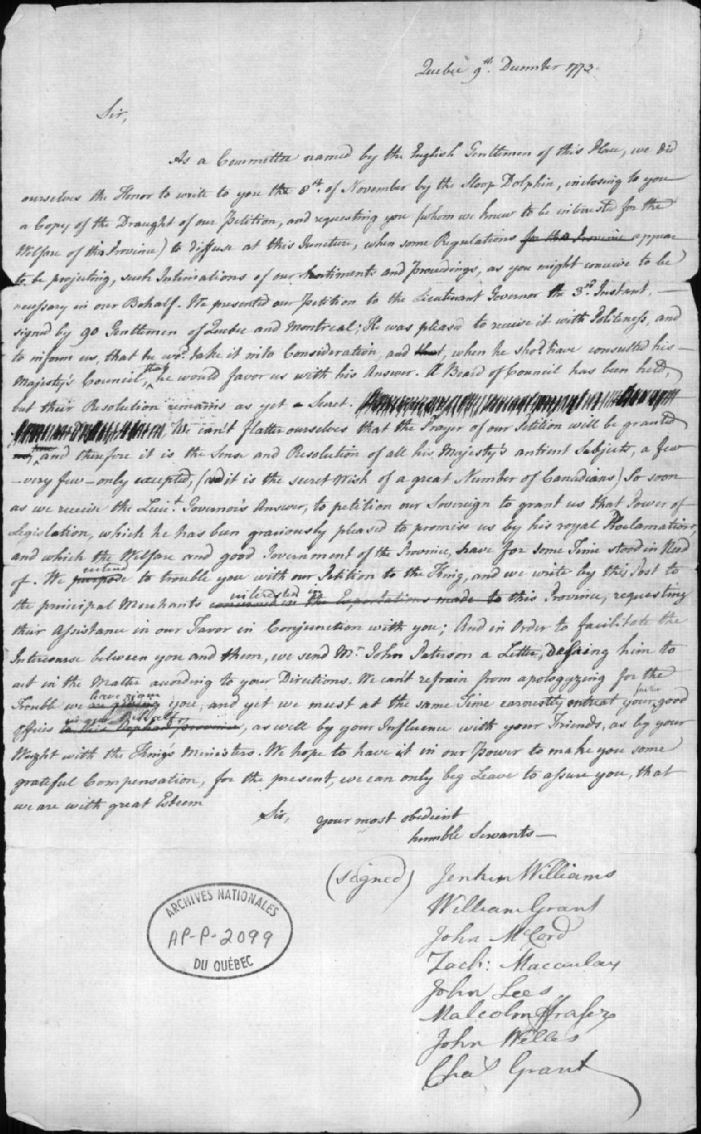 Documents concernant Jenkin Williams et le pouvoir législatif, 9 décembre 1773 - 3 novembre 1819, Archives nationales à Québec, Collection Centre d'archives de Québec, (03Q,P1000,S3,D2099).