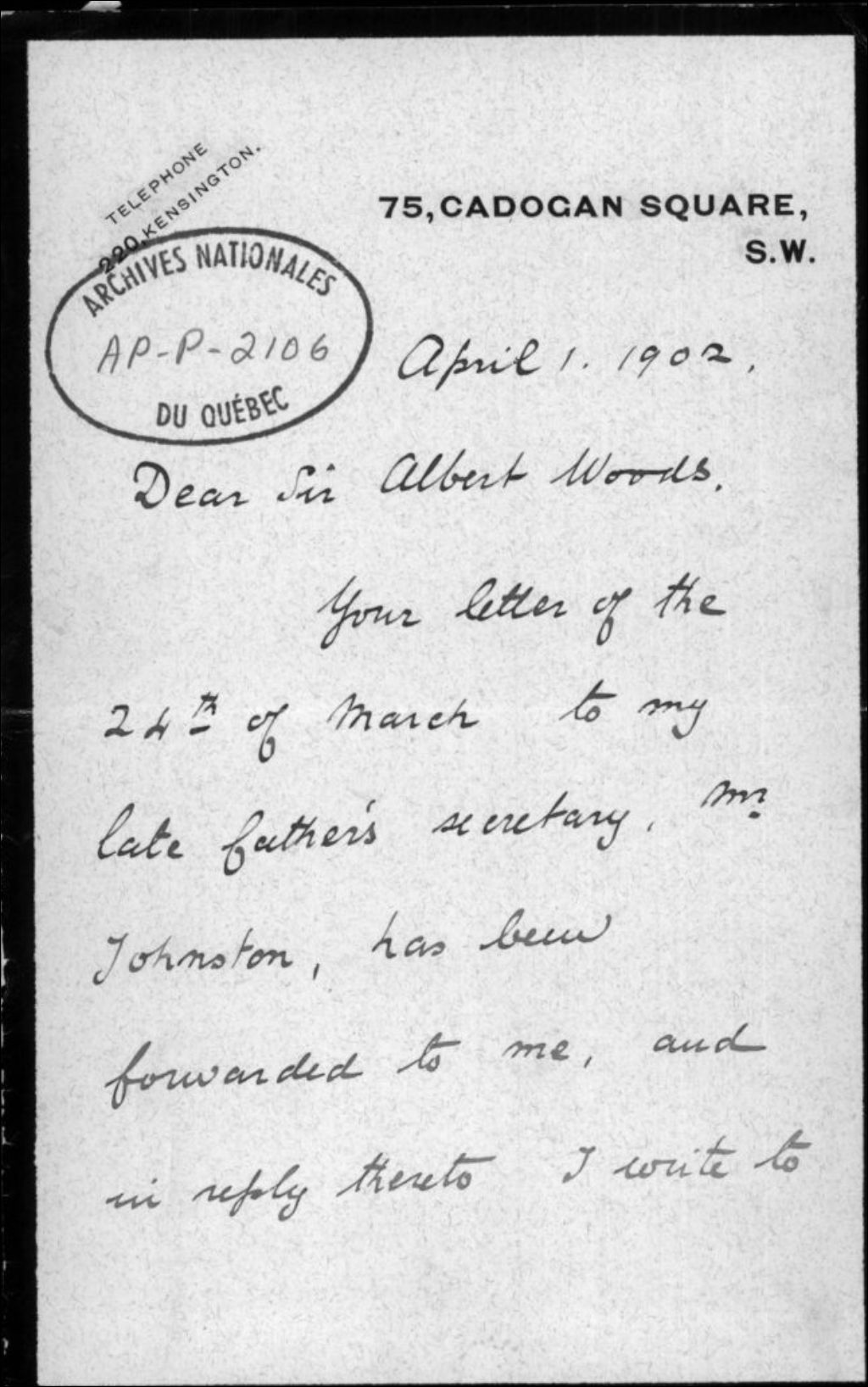 - Ce dossier est composé d'une lettre de Lord Dufferin en réponse à une lettre écrite par Albert Woods adressée au secrétaire de son père décédé et concernant un rendez-vous