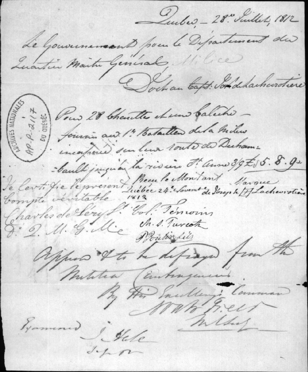 - Ce dossier contient un compte du Gouvernement envers le capitaine de Lachevrotière pour des charrettes fournies au 1er bataillon de la milice sur la route de Deschambault jusqu'à la rivière Ste-Anne. Le document est signé conjointement avec Charles de Léry