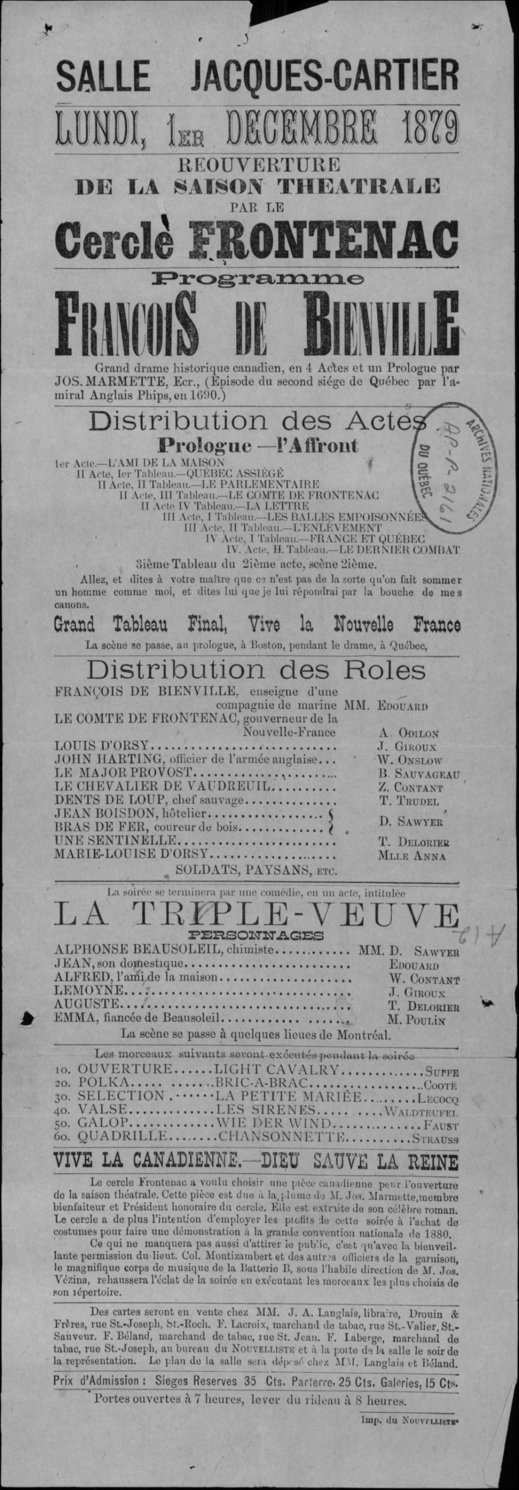 Représentation de la troupe de théâtre, le Cercle Frontenac, 1er décembre 1879, Archives nationales à Québec, Collection Centre d'archives de Québec, (03Q,P1000,S3,D2161).