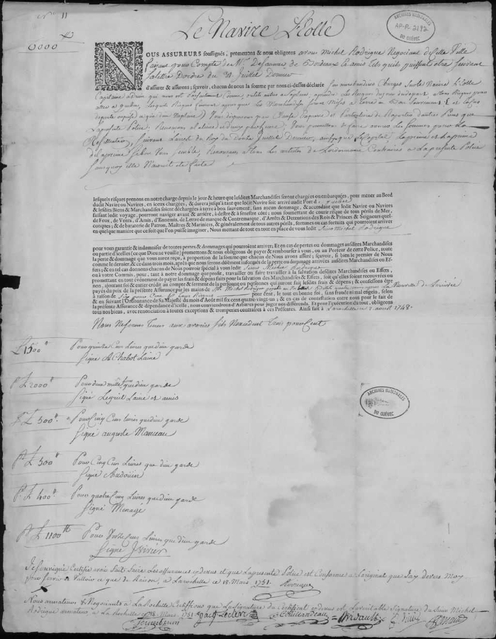 Assurance de Michel Rodrigue, 2 août 1748-18 mars 1751, Archives nationales à Québec, Collection Centre d'archives de Québec, (03Q,P1000,S3,D2192).