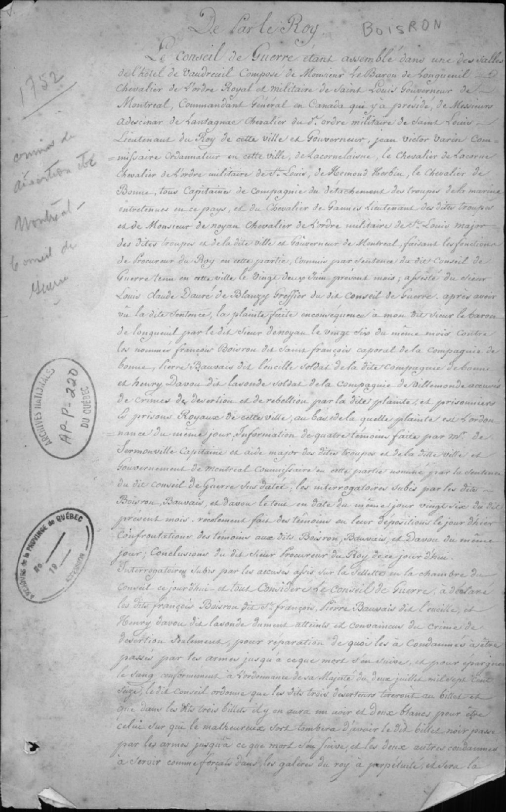 - Ce dossier est composé d'un document sur le procès de François Boisron dit Saint-François, Pierre Bauvais dit Leveillé et Henry Davou dit Lasonde, pour crime de désertion devant le conseil de guerre de Montréal (copie)