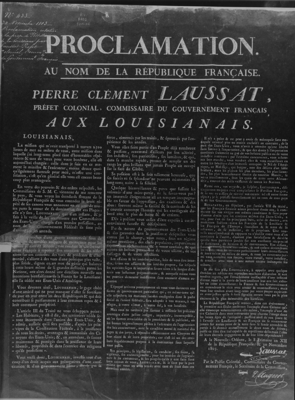 - Comprend: un serment d'allégeance du clergé à sa Majesté catholique; copie. Grand format. 26 août 1769 ; un serment d'allégeance des officiers, sergents, caporaux et soldats; copie. Grand format. 26 août 1769 ; deux serments d'allégeance des officiers à sa Majesté catholique; copies. Grands formats. 18 septembre 1769 ; deux proclamations de Don Alexander O'Reilly; copies. Grands formats. 21 août et 21 septembre 1769 ; une proclamation de Don Bernard de Galvez, copie. Grand format. 14 octobre 1777 ; une proclamation de Pierre Clément Laussat, préfet colonial, aux Louisianais, relativement à la rétrocession de la Louisiane par l¿Espagne, qui eut lieu le 30 novembre 1803, juste avant sa vente aux Américains. Copie. 30 novembre 1803