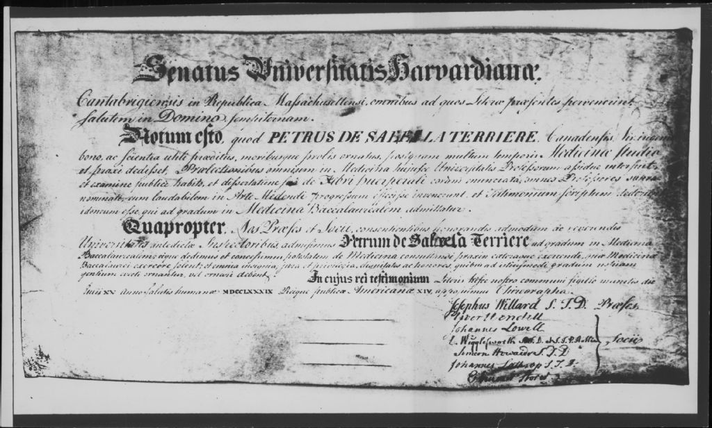 Diplôme et attestion remis à Pierre De Sales Laterrière par les universités de Harvard et de Cambridge, juillet 1789, Archives nationales à Québec, Collection Centre d'archives de Québec, (03Q,P1000,S3,D2213).