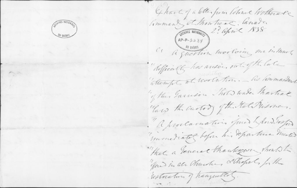 - Ce dossier est composé de 4 lettres concernant la rébellion de 1837-1838. La correspondance se détaille comme suit : une lettre originale et la copie dactylographiée (4 mars 1838), du Lieutenant-colonel McDougall à Sir Frederick Wetherall; un extrait d'une lettre et la copie dactylographiée (2 avril 1838), du Lieutenant-colonel Wetherall concernant la loi martiale; une autre lettre originale (31 mai 1838) de Geo. Grey au Lieutenant-colonel McDougall concernant la loi martiale; une lettre sans date et la copie dactylographiée (sur laquelle on a inscrit novembre 1837), de John Eden à Wetherall concernant la rébellion de 1837-1838