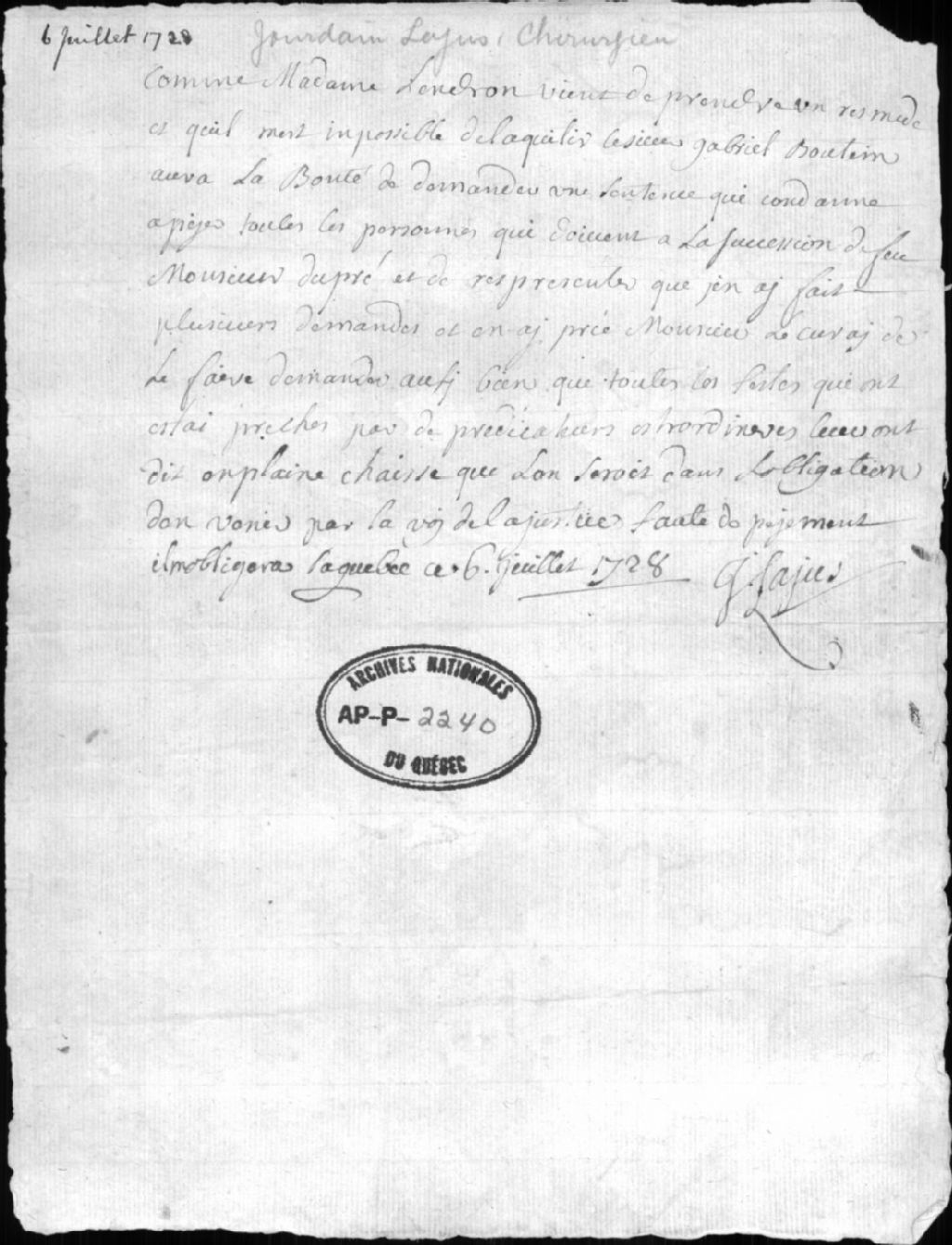 Lettre du chirrurgien Lajue à Gabriel Boutin, 6 juilet 1728, Archives nationales à Québec, Collection Centre d'archives de Québec, (03Q,P1000,S3,D2240).