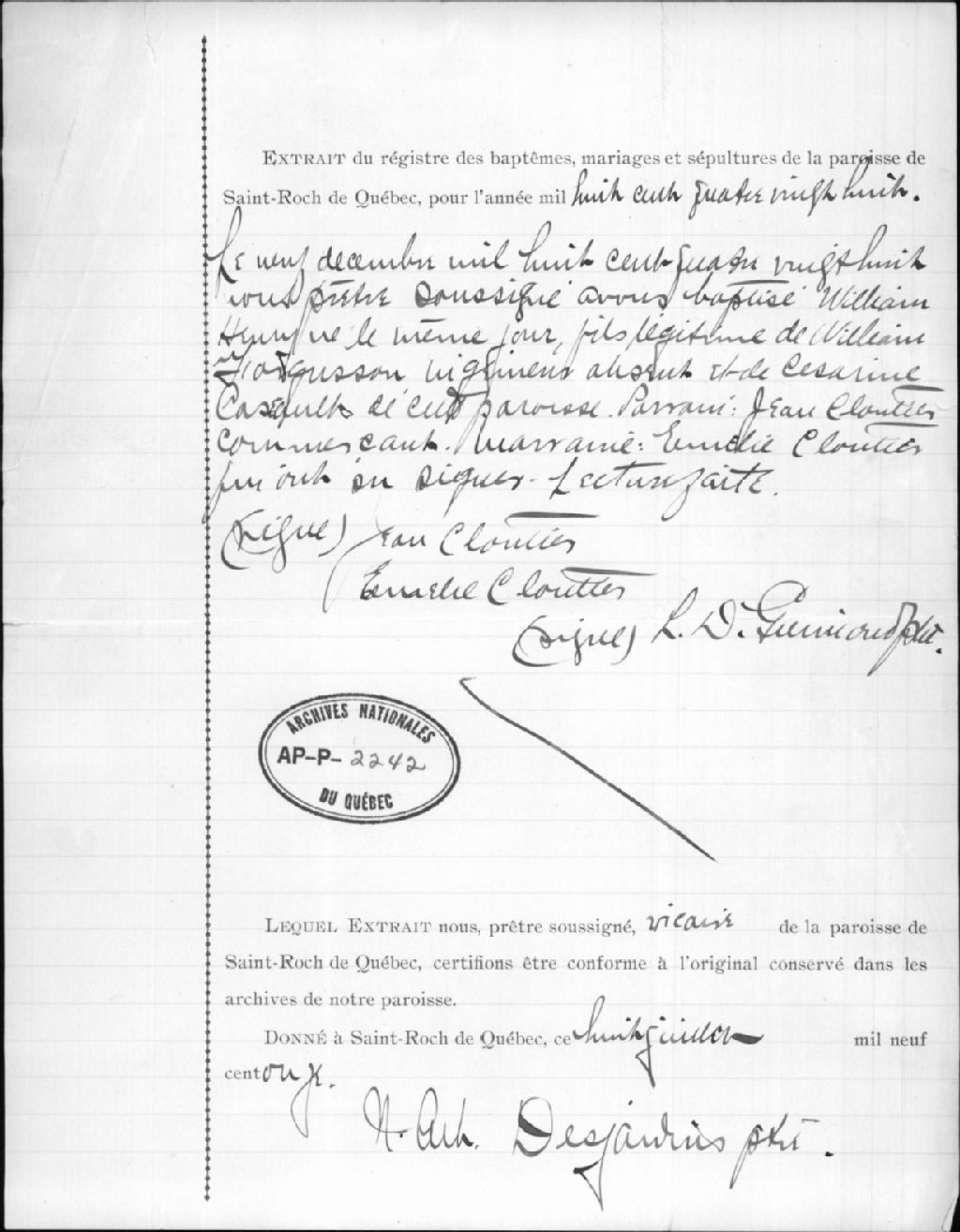 Extrait de baptême de William Henry Fergusson, 9 décembre 1888-8 juillet 1911, Archives nationales à Québec, Collection Centre d'archives de Québec, (03Q,P1000,S3,D2242).