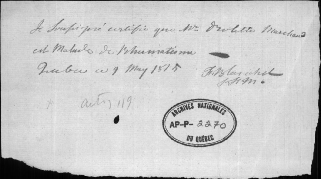 Certificat médical de M. Drolette, 9 mai 1815, Archives nationales à Québec, Collection Centre d'archives de Québec, (03Q,P1000,S3,D2270).