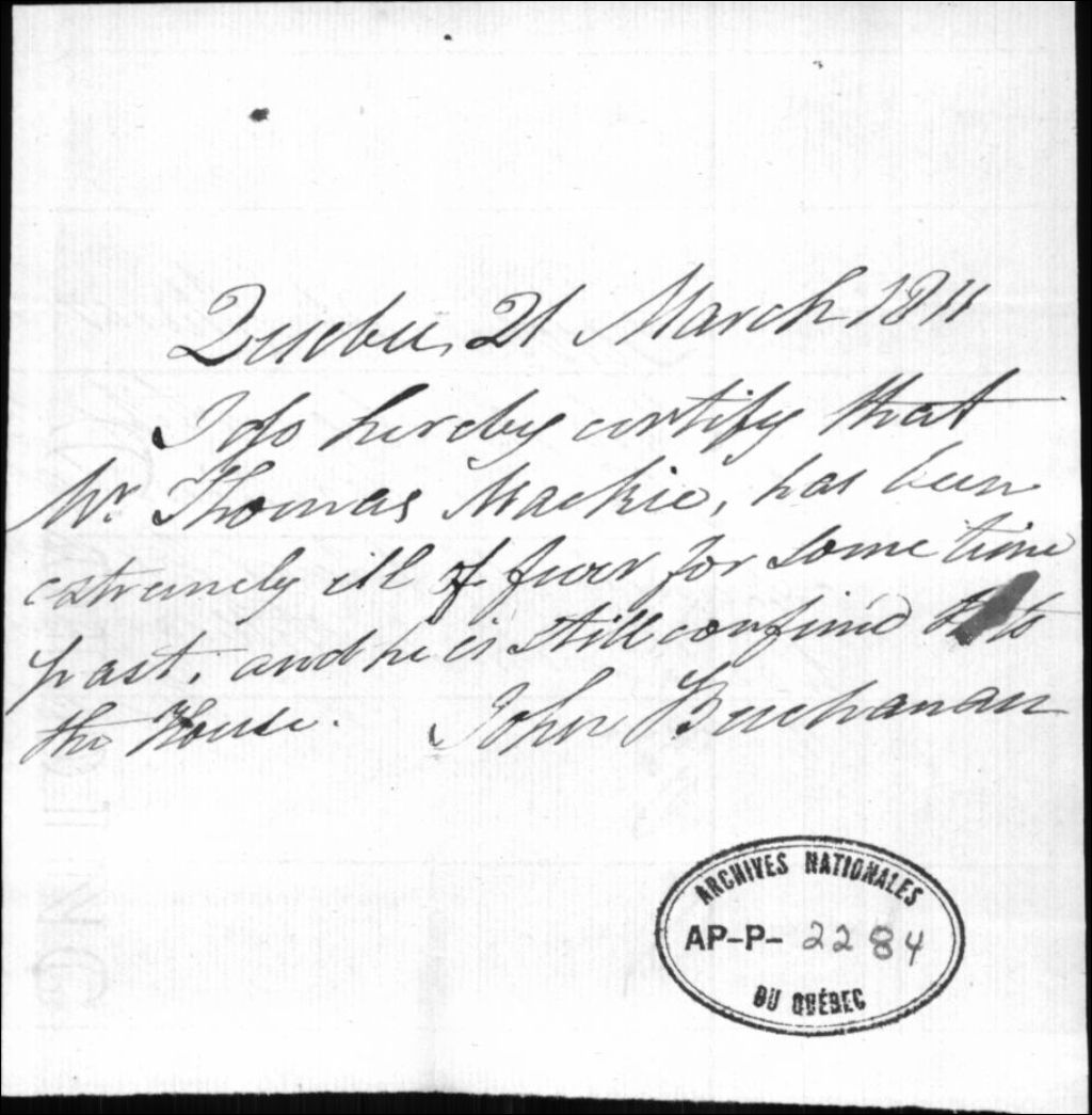 - Certificat médical pour MacKie (McKay ?), signé John Buchanan