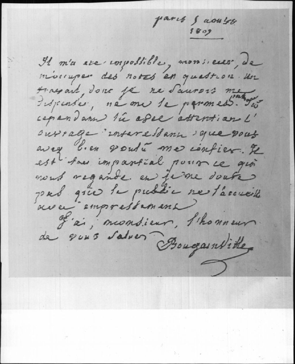 Ce dossier est constitué d'un photostat d'une lettre écrite par Bougainville à Paris pour un destinataire inconnu. Il explique que la rédaction des notes demandées n'est pas encore commencée, il trouve l'ouvrage intéressant et ne doute pas que le public l'accueillera avec empressement.Cette lettre est peut-être en lien avec le conseil de guerre qui jugea les responsables du désastre de Trafalgar en 1809 et que Bougainville présida. Elle peut aussi être destinée à un autre membre de l'Institut de France (qui regroupait entre autres l'Académie française) dont faisait partie Bougainville. (Voir Wikipédia)