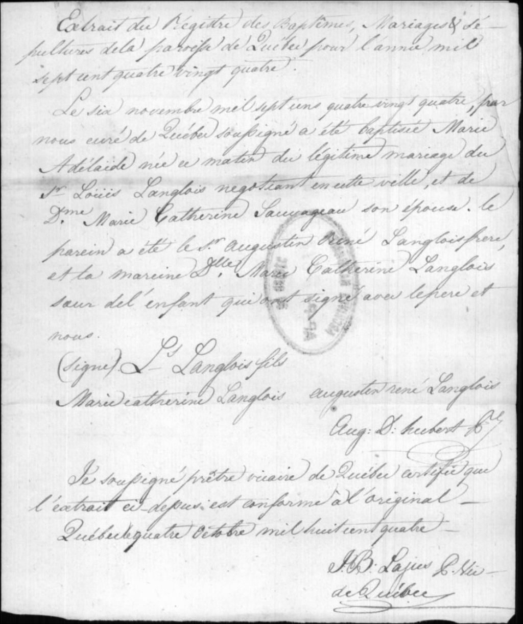 - Extrait de baptême de Marie-Adélaïde Langlois baptisée en la paroisse de Québec en 1784