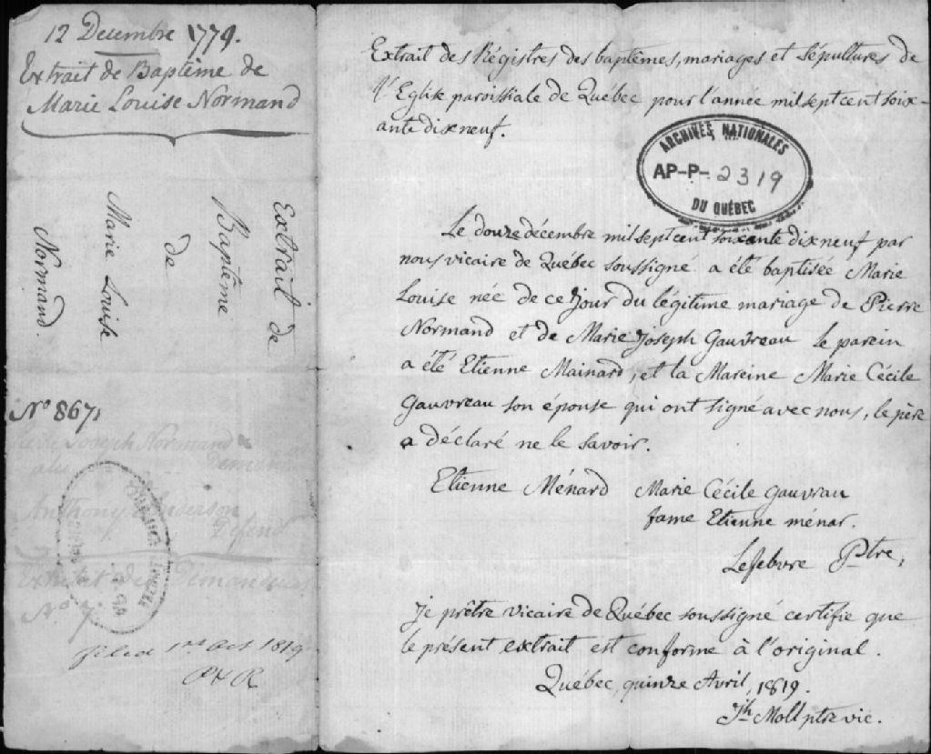 Extrait de baptême de Marie-Louise Normand baptisée en l'église paroissiale de Québec en 12 décembre 1779