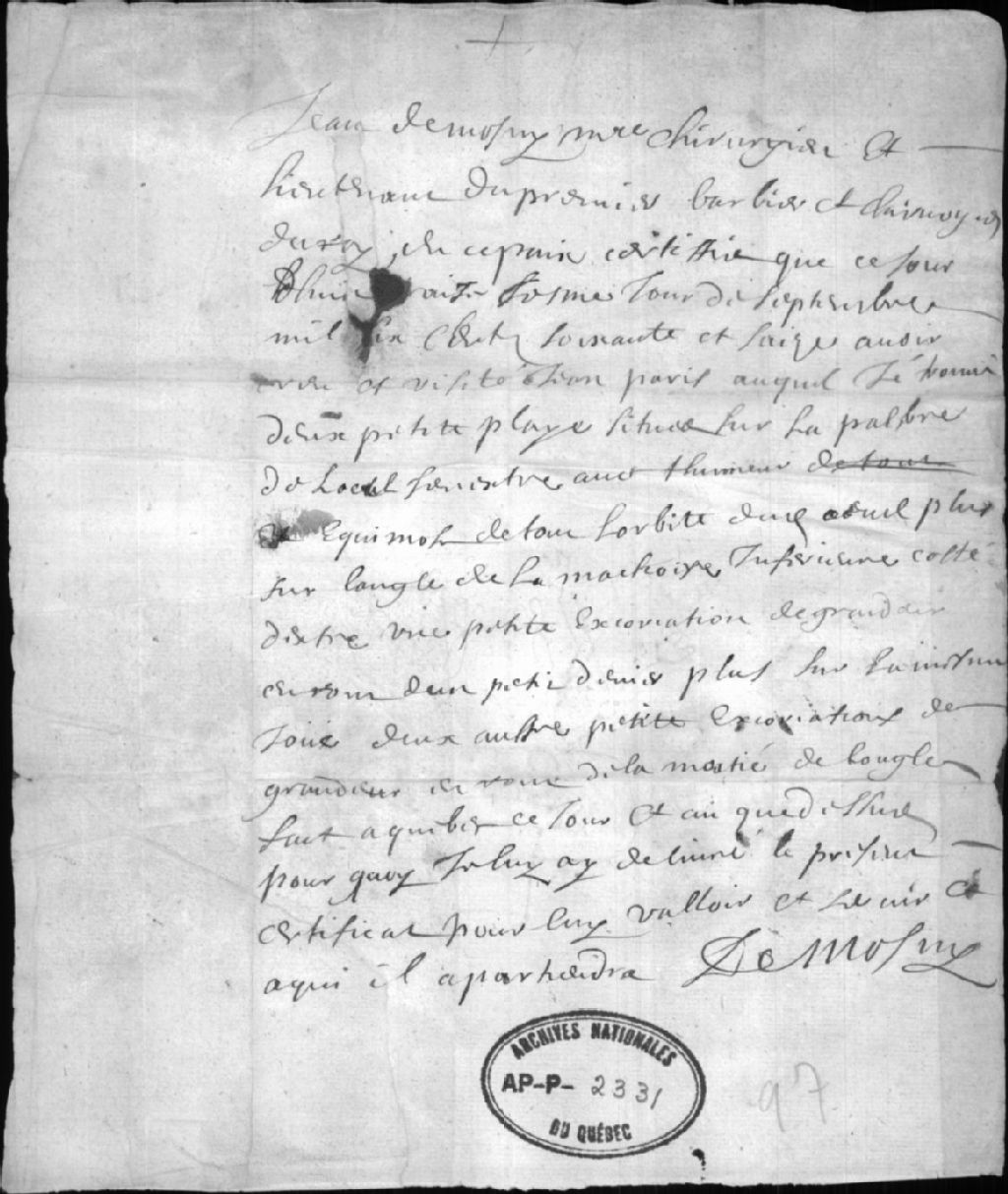 Certificat médical de Jean Demosny, maître chirurgien et lieutenant du premier barbier et chirurgien du roi, en faveur de Jean Paris, 20 septembre 1676, Archives nationales à Québec, Collection Centre d'archives de Québec, (03Q,P1000,S3,D2331).