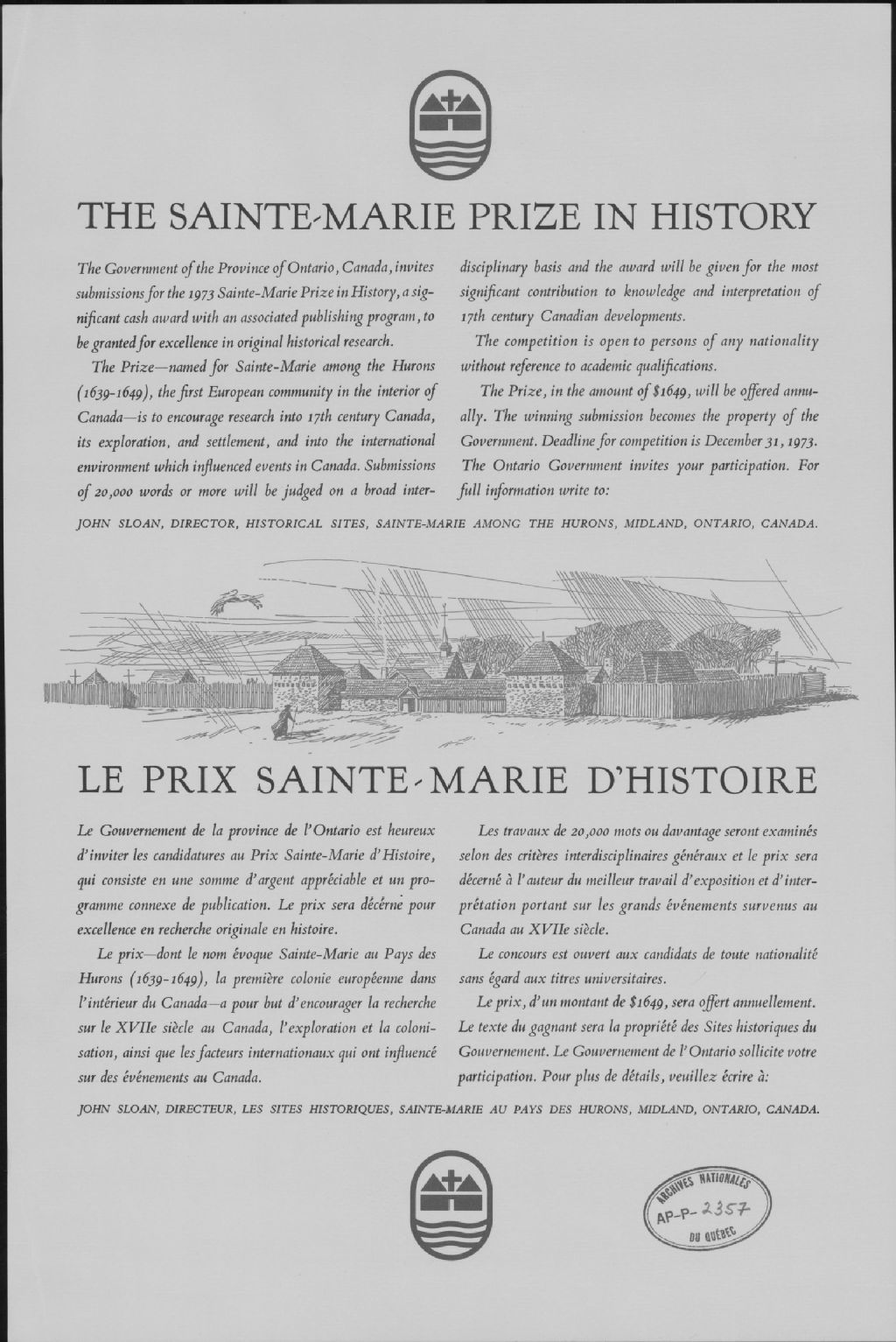 - Lettre de John R. Sloan et placard adressés à Raymond Gariépy, concernant le prix d'histoire de Sainte-Marie au pays des Hurons. C'est un prix de 1649$ remis annuellement à celui qui fait un travail écrit sur l'histoire canadienne du 17e siècle