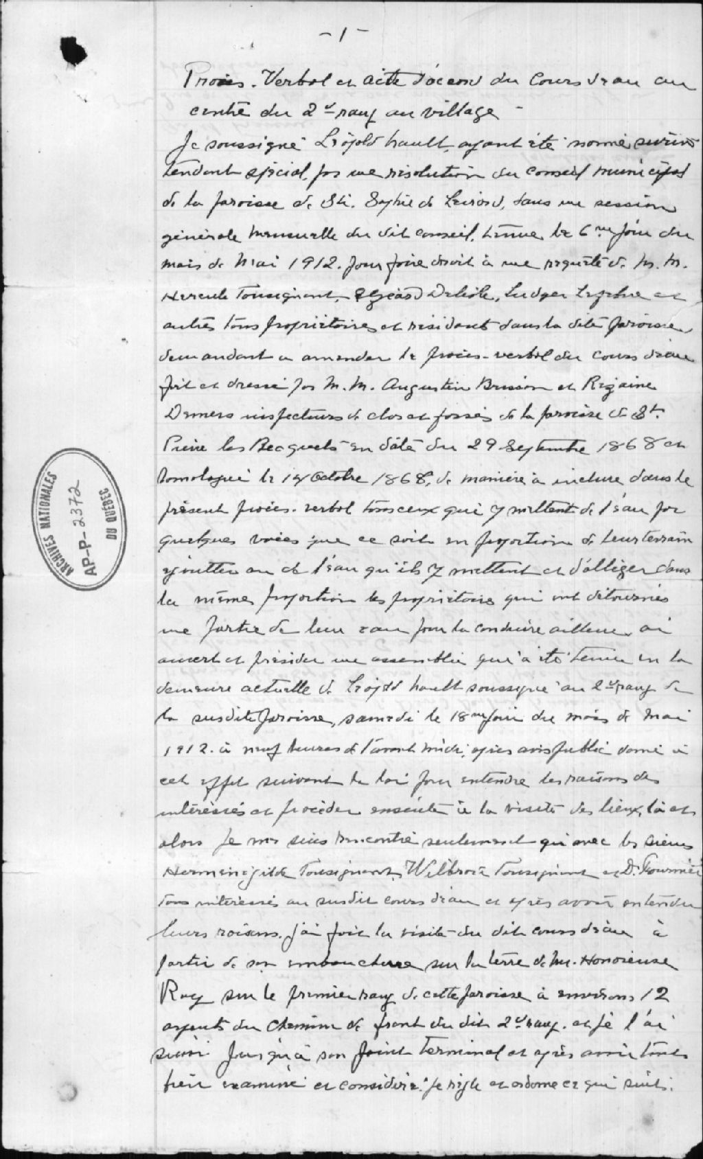 - Ce dossier est composé du procès-verbal et de l'acte d'accord relatifs au cours d'eau au centre du 2ème rang du village de la paroisse Sainte-Sophie de Levrard