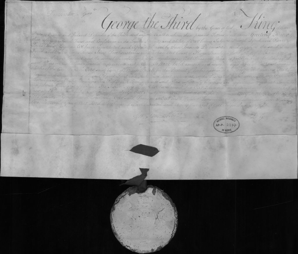 - Ce dossier est contitué d'une commission pour Pierre-Louis Panet et David Lynd les nommant conjointement protonotaires de Québec et greffiers de la Cour du Banc du roi le 11 décembre 1794. Un sceau est rattaché au document, grand format