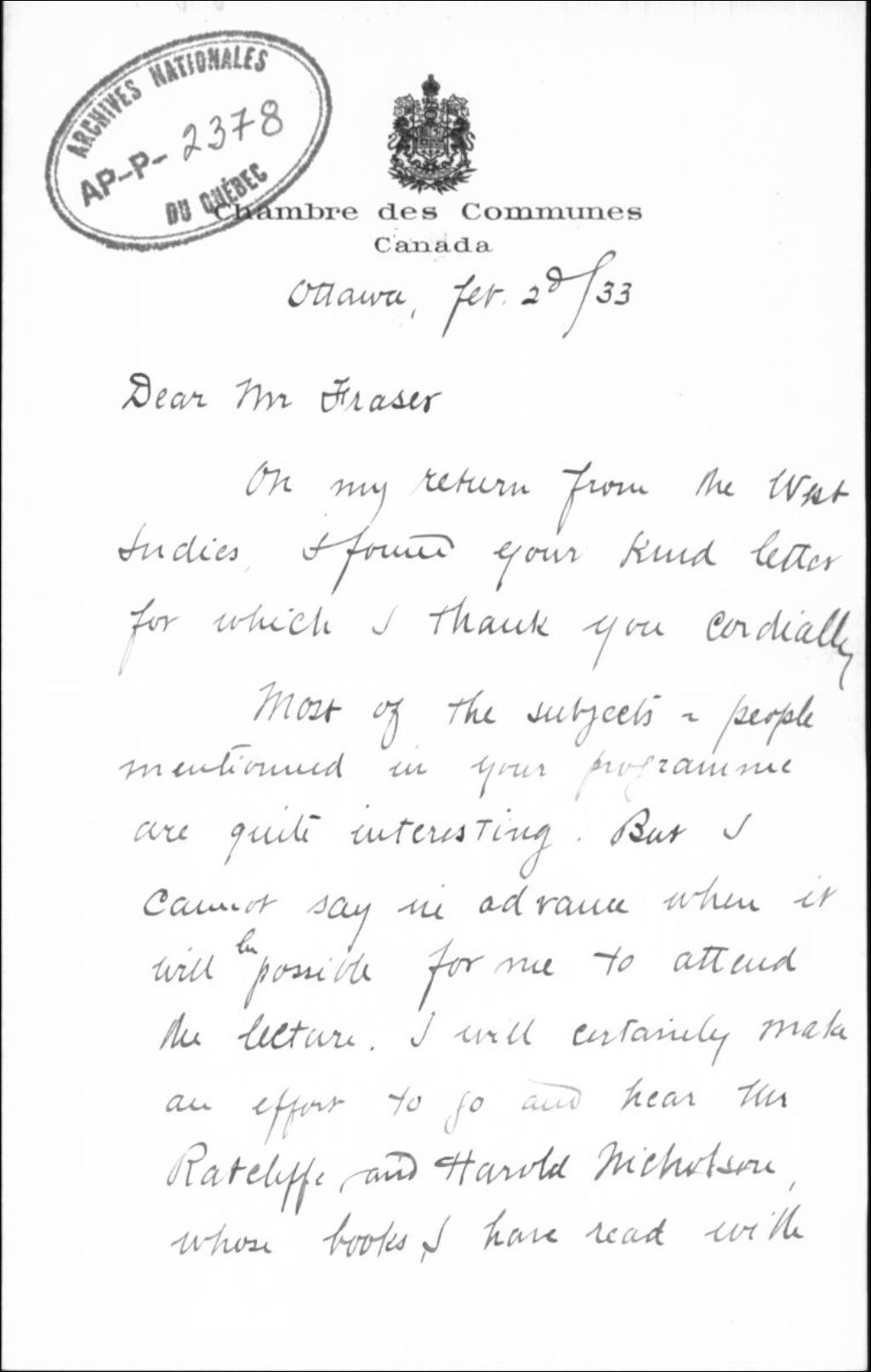 - Ce dossier est composé d'une lettre (2 pages) d'Henri Bourassa à M. Fraser dans laquelle il accuse réception de sa lettre et promet de faire son possible pour répondre à ses demandes